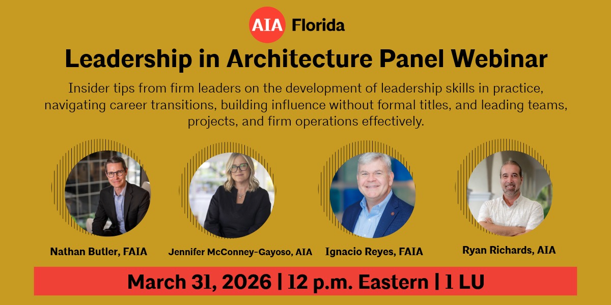 As architects advance in their careers, leadership skills become critical to managing teams, projects, and firm operations. This panel discussion brings together four leaders from architecture firms across Florida to share candid insights from their journeys, including how leadership develops throughout one’s career. Through a moderated conversation, panelists will discuss the development of leadership skills in practice, navigating career transitions, building influence without formal titles, and leading teams, projects, and firm operations effectively. Topics include decision-making, delegation, risk management, and balancing professional growth with personal life. This program is designed for emerging professionals, project architects, and mid-career architects who aspire to leadership roles, as well as current firm leaders interested in mentorship and succession. Participants will gain practical, experience-based perspectives applicable across firm sizes and practice types.